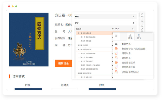提供谱书创建与管理、编辑目录、封面/封底样式设置、生成体例